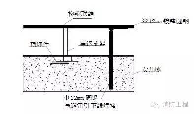 1.首先在屋面結(jié)構(gòu)鋼筋綁扎時(shí),從避雷引下線柱鋼筋引出Φ12mm鍍鋅圓鋼與屋面避雷帶連接,其接點(diǎn)做法見圖: