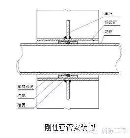 1.剛性套管安裝:主體結(jié)構(gòu)鋼筋綁扎好后,按照給排水施工圖標(biāo)高幾何尺寸找準(zhǔn)位置,然后將套管置于鋼筋中,焊接在鋼筋網(wǎng)中,如果需氣割鋼筋安裝的,安裝后必須用加強(qiáng)筋加固,并做好套管的防堵工作。剛性套管安裝如圖所示: