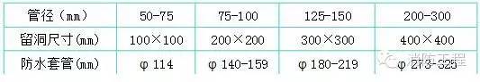 3.嚴(yán)格按照標(biāo)準(zhǔn)圖集加工制作防水套管、穿墻套管,套管長(zhǎng)度按結(jié)構(gòu)施工圖尺寸確定,套管管徑參照下列標(biāo)準(zhǔn):