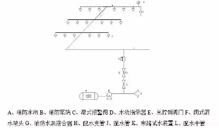 自動噴水滅火系統由水源、加壓送水、報警閥、管網噴頭以及火災探測系統等組成。本自動噴水滅火系統屬于濕式自動噴水滅火系統。其結構如下圖: